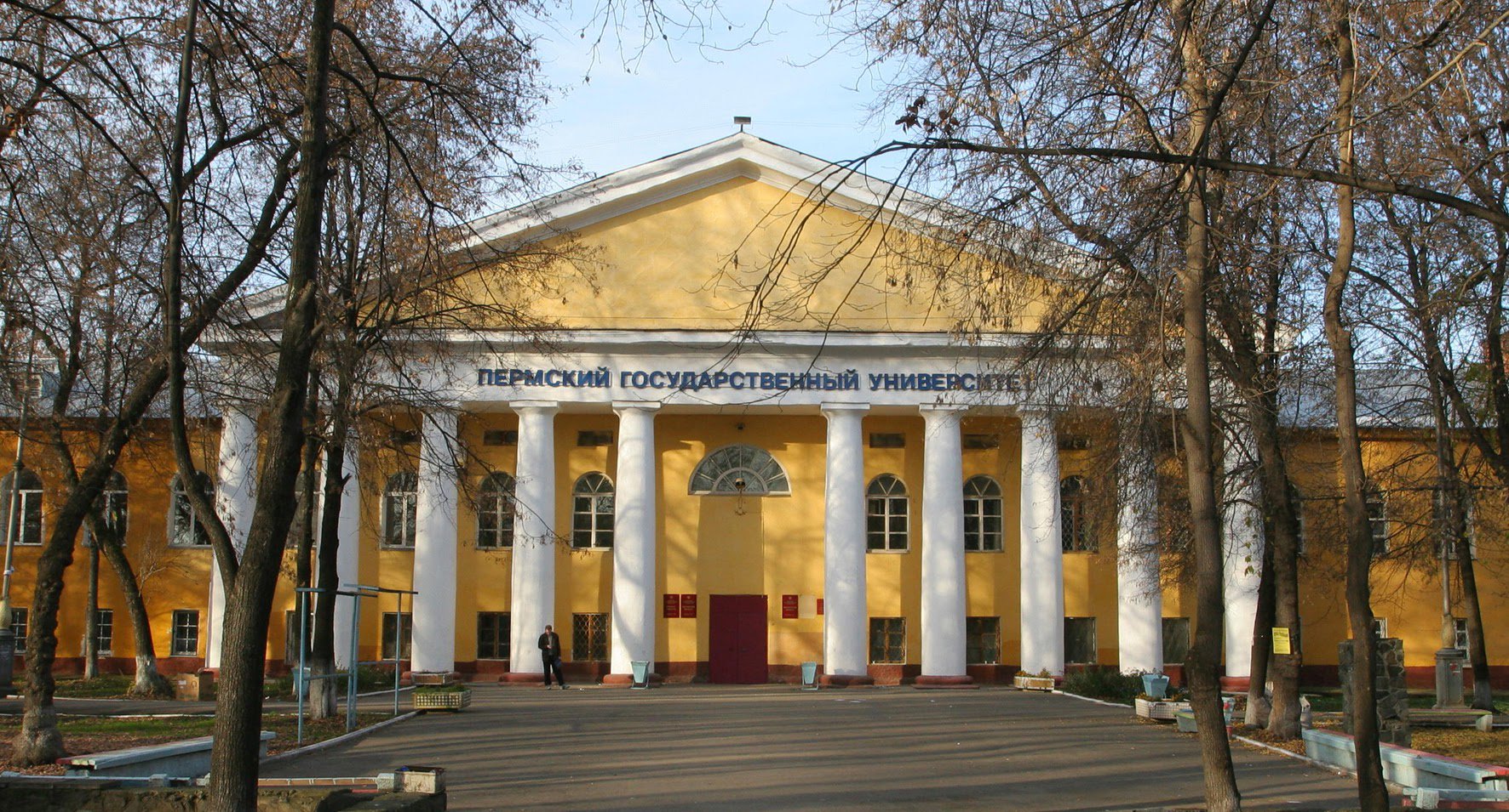 Пермский госуниверситет. Явно снесли одну колонну по середине здания и прорубили вход.